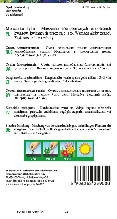 Mieszanka różnobarwnych wieloletnich kwiatów, kwitnących przez całe lato. Wymaga gleby żyznej. Zastosowanie: na rabaty, do ogródków skalnych.