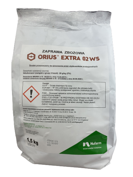 Zaprawa Zbożowa Orius Extra 02 WS jest środkiem grzybobójczym w formie proszku do sporządzania zawiesiny wodnej o działaniu układowym do zaprawiania w zaprawiarkach przystosowanych do zapraw ciekłych i zawiesinowych ziarna siewnego pszenicy ozimej i jarej oraz jęczmienia ozimego i jarego przed chorobami grzybowymi.